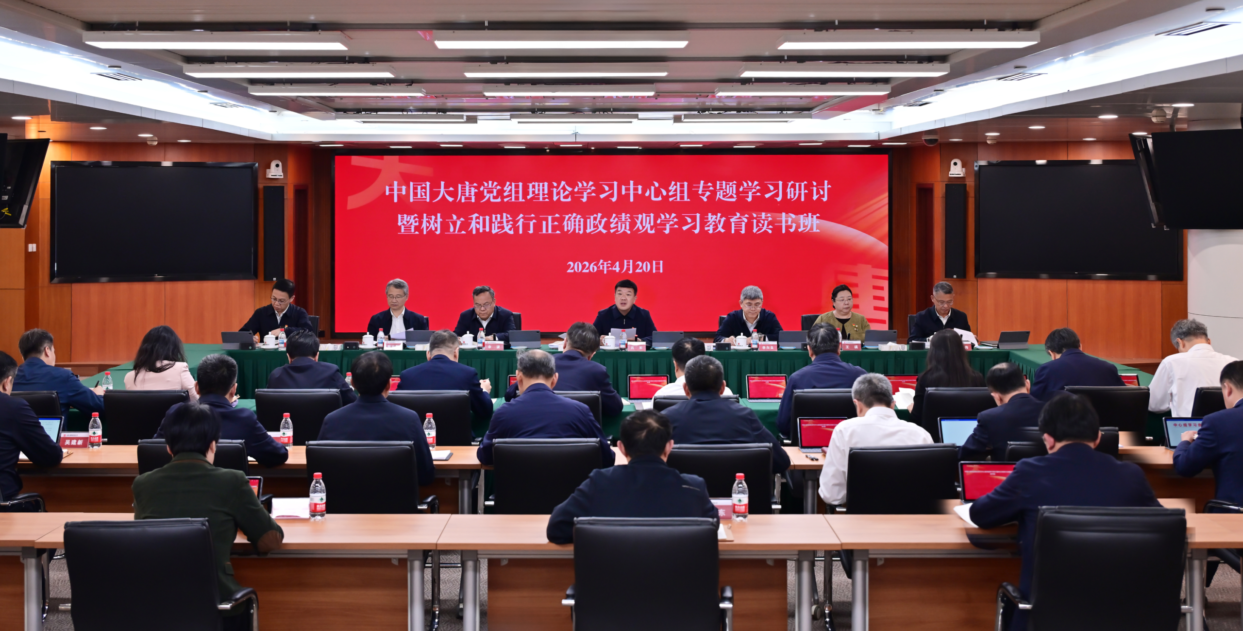 4月20日,中国大唐集团有限公司党组理论学习中心组举行专题学习研讨暨树立和践行正确政绩观学习教育读书班,深入学习习近平总书记关于在全党开展树立和践行正确政绩观学习教育的重要指示,原原本本学习《习近平关于树立和践行正确政绩观论述摘编》,坚持一体推进学查改,为人民出政绩、以实干出政绩,推动集团公司“十五五”开好局、起好步,更好服务能源强国和美丽中国建设。